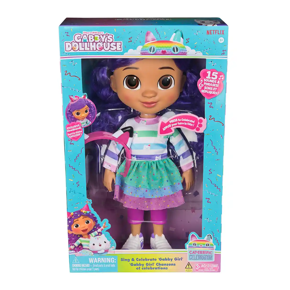 🎀 Bring home the magic of Gabby’s Dollhouse ✨🏠 with the Sing and Celebrate Gabby Girl Doll! Standing over a foot tall 📏 (33cm), this exclusive Gabby is dressed in her party-ready celebration outfit 🎂 and comes with a kitty headband 🐱🎉 that transforms for double the fun 🔄.