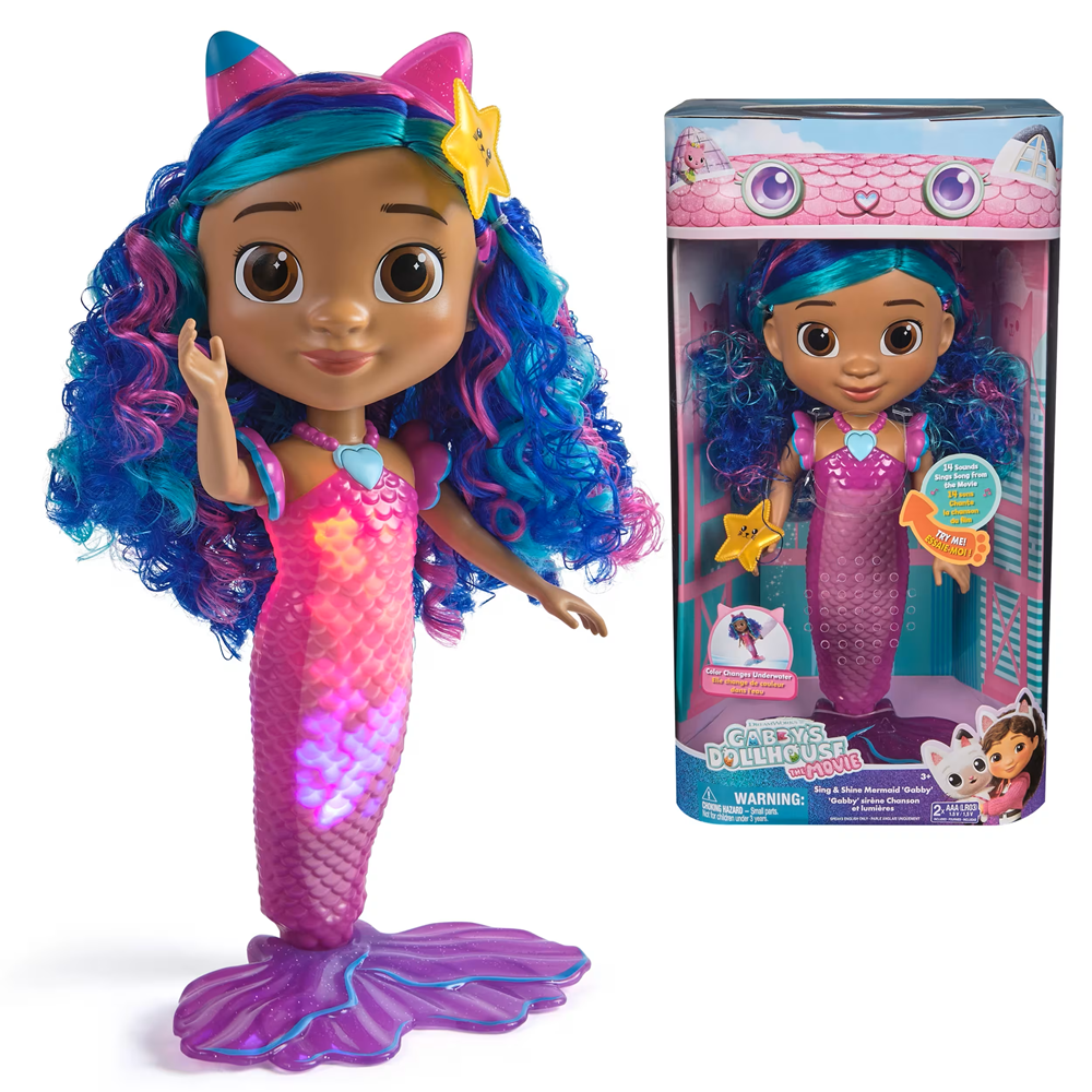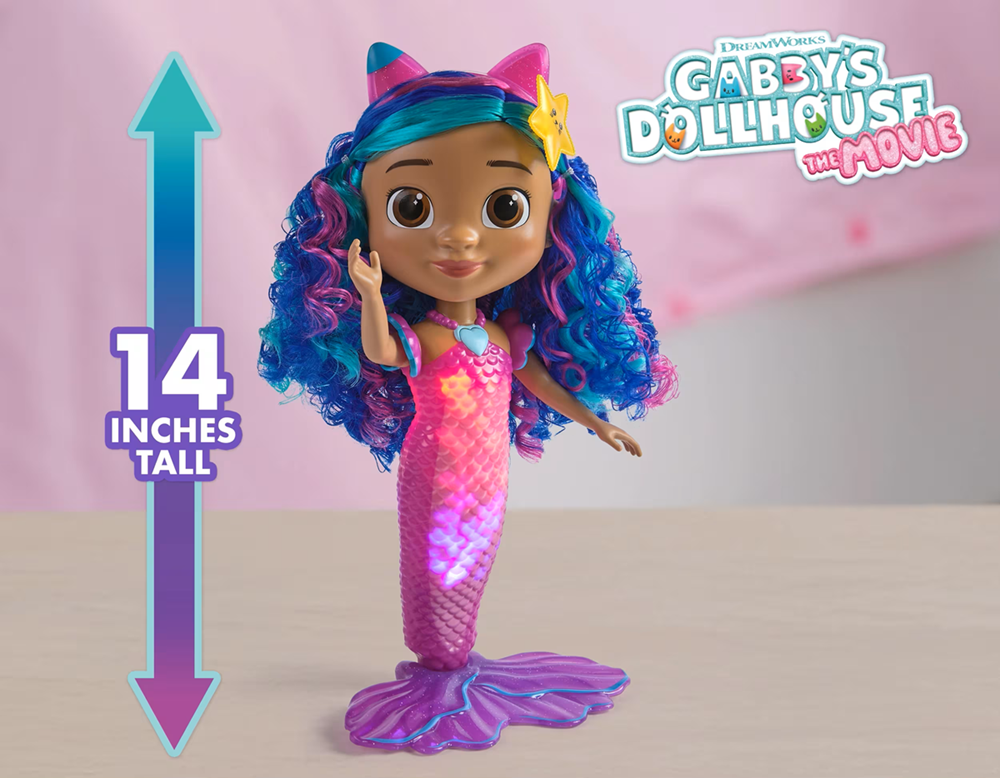 Dive into a meow-gical adventure with Sing & Shine Mermaid Gabby, inspired by Gabby’s Dollhouse: The Movie! 💖 Press her sparkling 💎 heart necklace to activate bright lights, fun sounds, and movie music 🎶, bringing Gabby’s world to life.